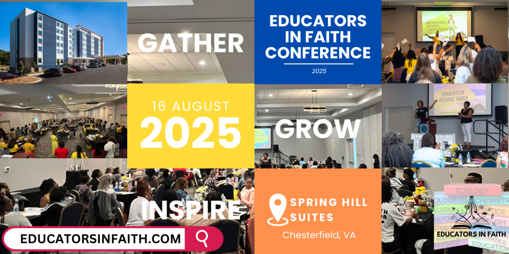 We are excited to invite educators from Richmond, Petersburg, Henrico, Chesterfield, Sussex, Southampton, Colonial Heights, Dinwiddie, Prince George, Hopewell, Hanover, Greensville, Tidewater, VA, the DMV, NC, and beyond to join us on Saturday, August 16, 2025, at 9:00 AM at the SpringHill Suites Chester Conference Center. Together, we’ll explore how personal faith can positively influence your work as an educator, connecting through meaningful conversations and collaboration. You’ll leave encouraged to confidently bring your beliefs into your classroom and school in ways that uplift and support all. The day will conclude with a powerful collective prayer for the 2025-2026 school year. Let’s learn, grow, and inspire together—we can’t wait to see you there!